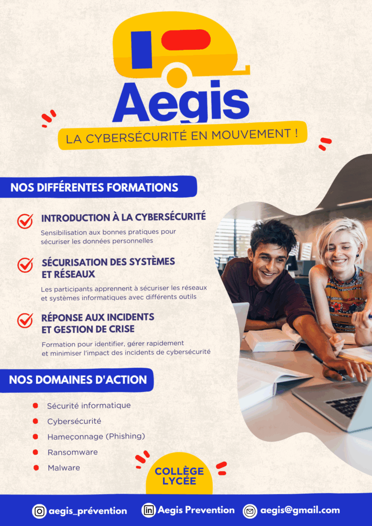 L’affiche reprend les codes visuels de la cybersécurité avec un design moderne et dynamique. Les couleurs vives (jaune, rouge, bleu vif) attirent l’attention, tandis que l’illustration de la caravane symbolise l’accessibilité et l’approche interactive d’AEGIS. La photo de jeunes élèves permet d’identifier immédiatement la cible et de capter l’attention du public concerné, renforçant ainsi l’impact du message de sensibilisation dès le premier regard.